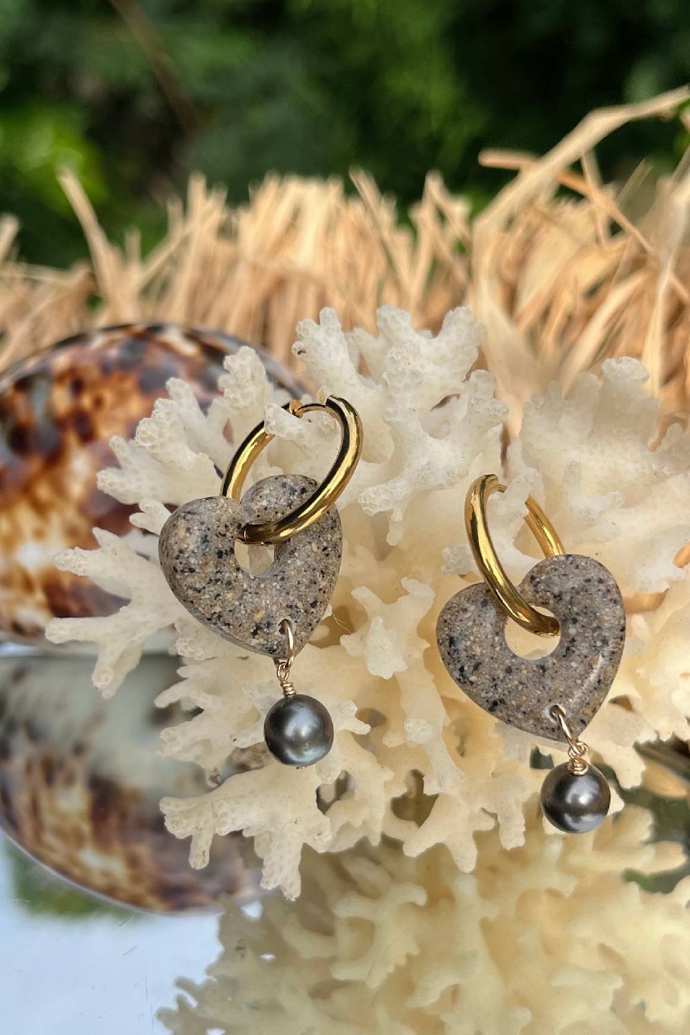 Craquez pour ces boucles d’oreilles exclusives, composées de créoles dorées, d’un pendentif en forme de cœur fait avec le sable de la célèbre plage de PK 18 à Tahiti, figé dans de la résine et d’une véritable perle de Tahiti aux reflets profonds.